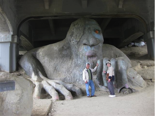 I thought this may be the solution to any unemployment issues Seattle might have. The City would hire all those folks as people-pushers, station them at the bottom of the most used, popular hills, and they could push people up the hills all day. Of course, they could only be the young strong unemployed and tourists could give the people pushers tips in addition to their minimum wage. Anyway………………..here we are at the Troll. We were supposed to climb up there and try to poke the Troll’s eye out but, since there were several other groups trying to take pictures by the Troll, we never got to that part. Besides, asking my daughter-in-law to push me up onto the Troll’s shoulder may be taking advantage of her kindness.